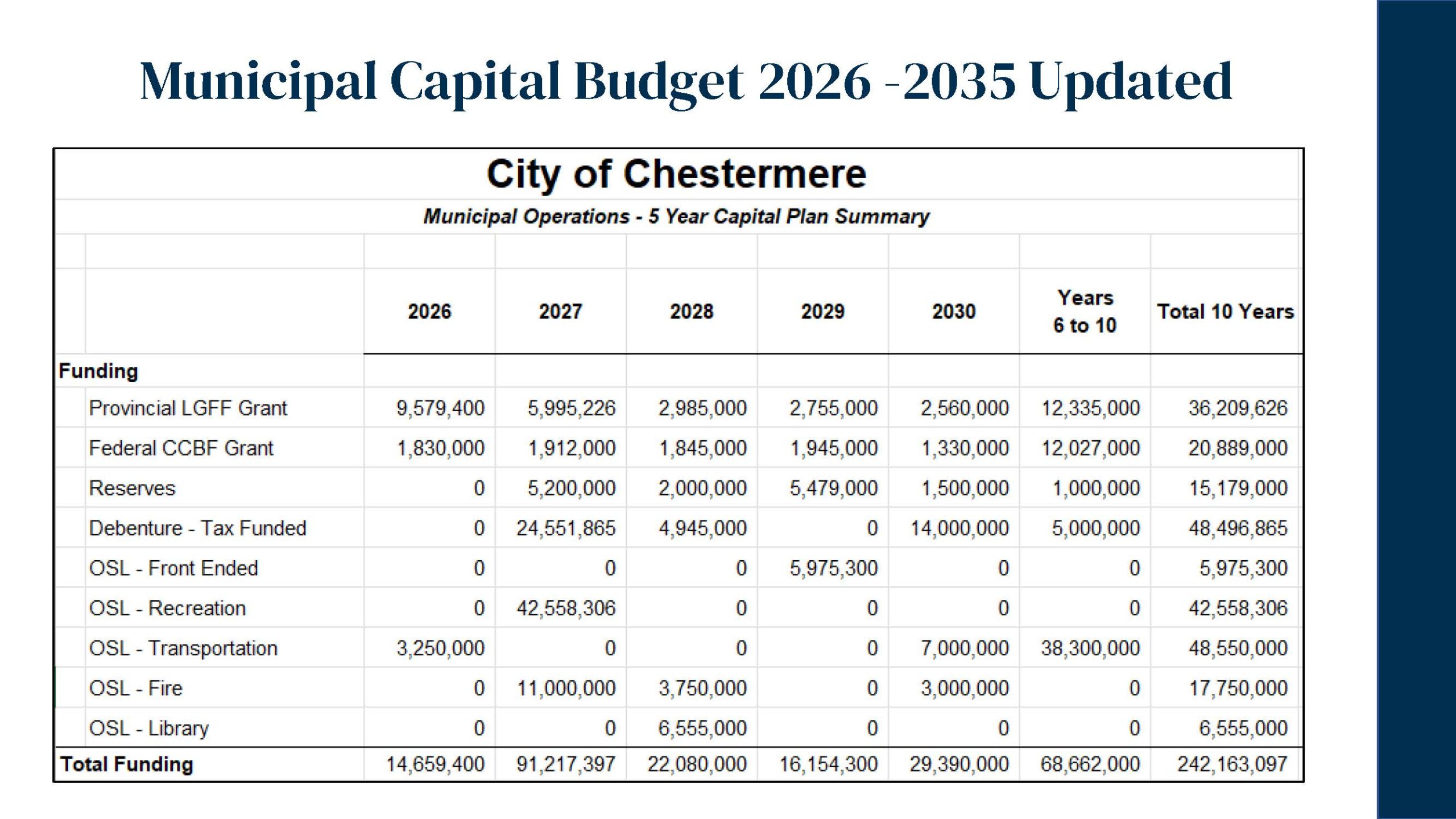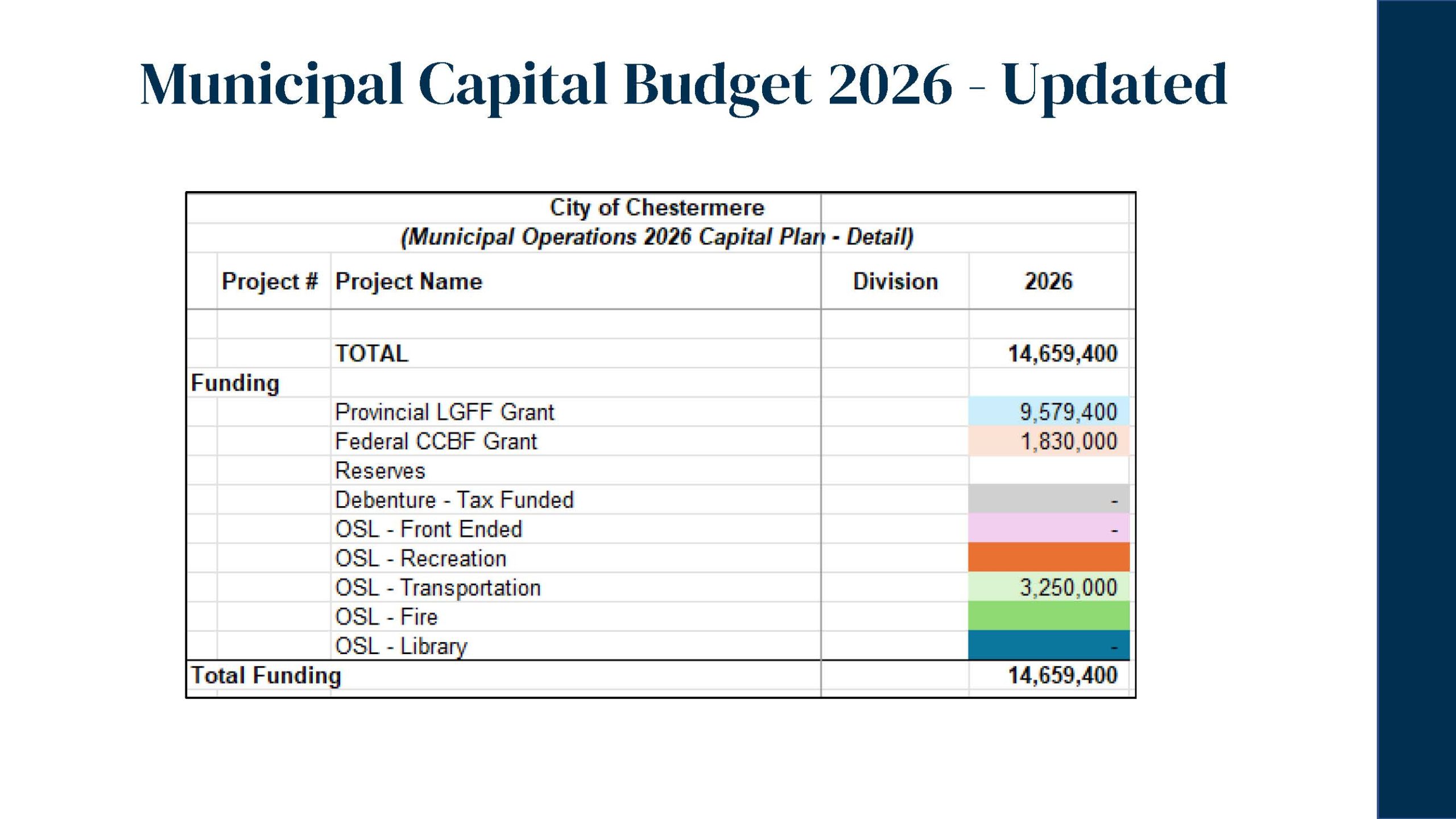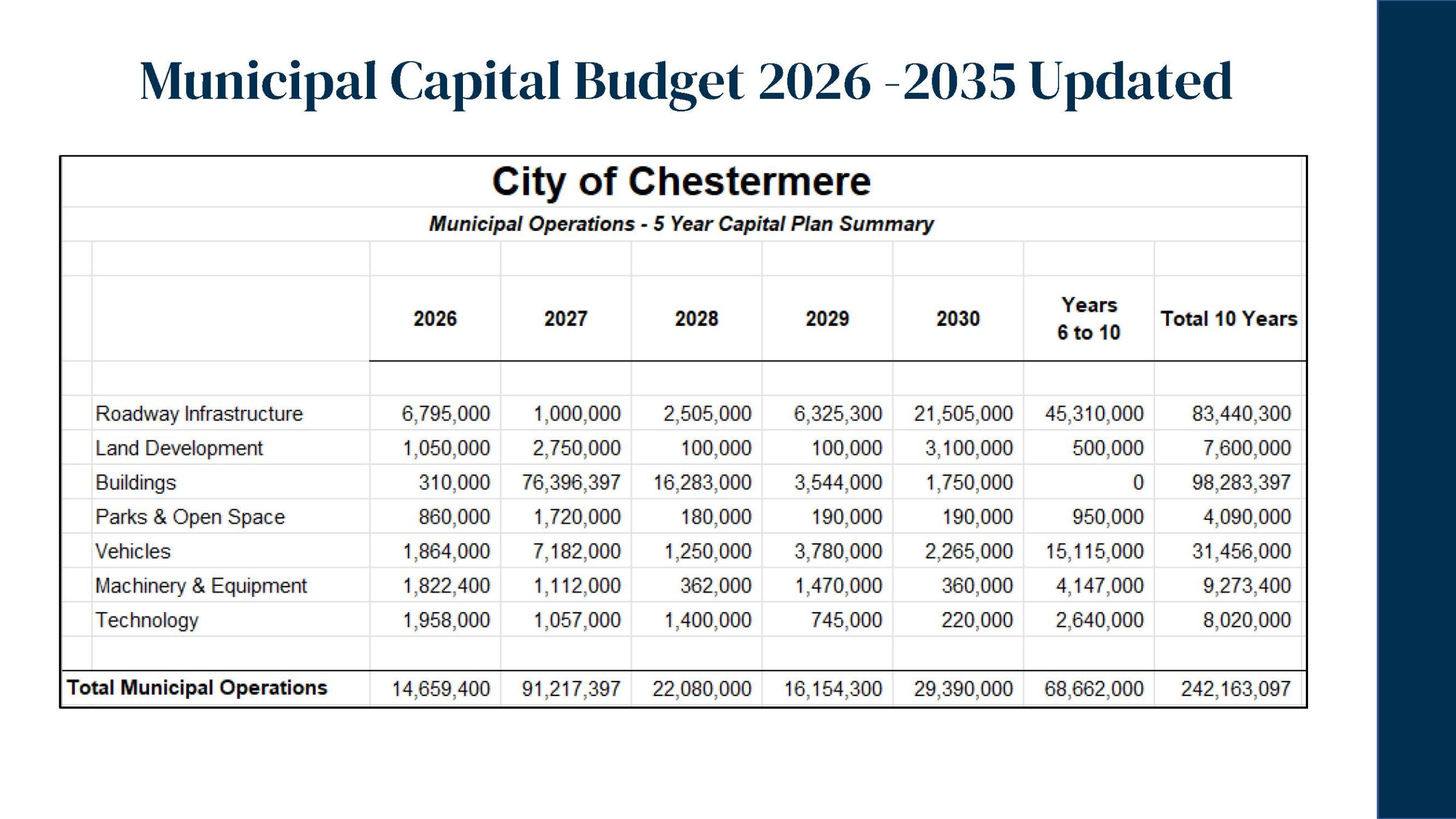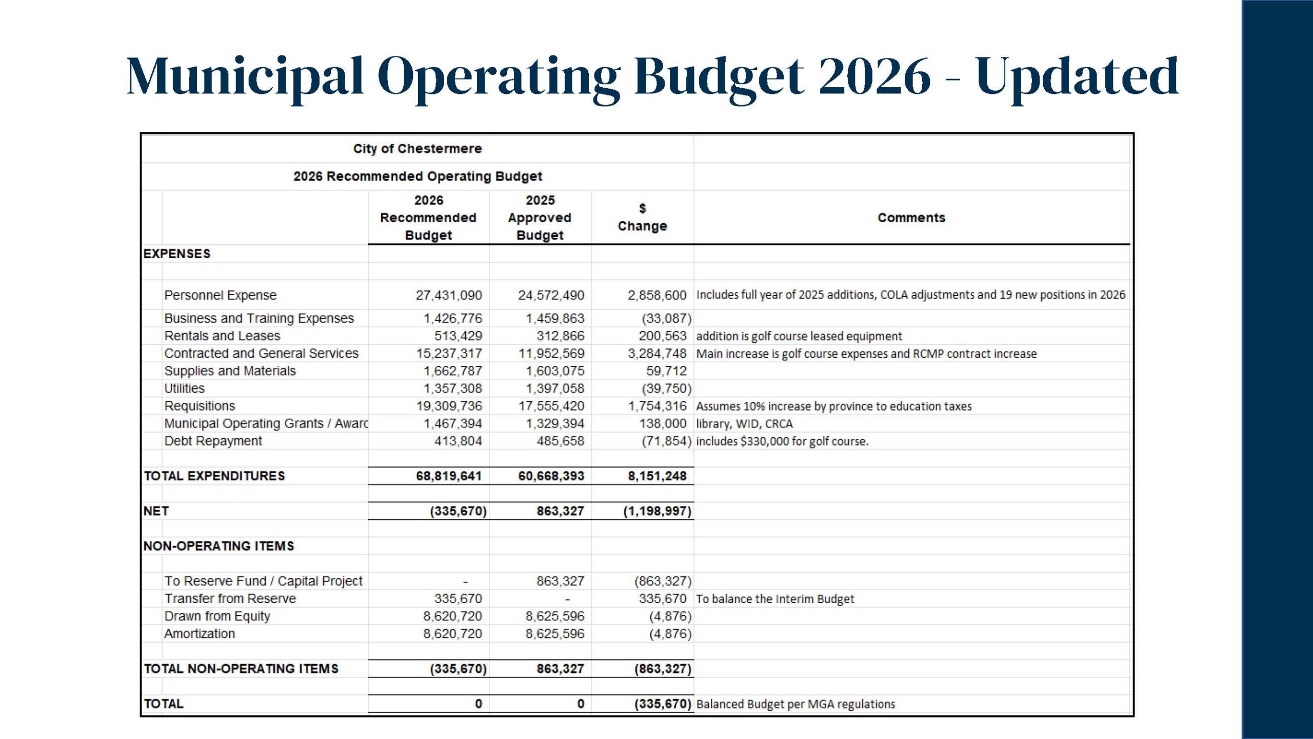 On December 16, 2025, Chestermere City Council approved the 2026 Interim Operating and Capital Budgets, focused on maintaining core municipal services, investing in community safety and recreation, and supporting the growing needs of the community.