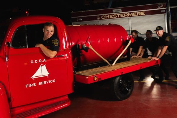 The origins of CFS trace back to late 1979/early 1980 when Wayne Paquette and Roy Berg established the Summer Village of Chestermere Lake Fire Protection Group. The village office, which included a two-bay fire hall, was completed in September 1979 at 156 East Chestermere Drive. Prior to this, the first fire hall was a small structure at 111 East Chestermere Drive, near the water, which served as a first aid station and housed a 1952 Ford truck with a gas-powered water pump.